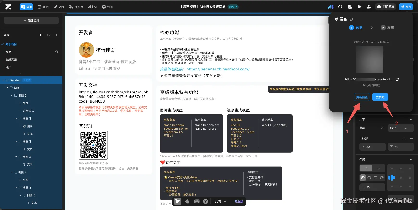 你可以使用 Zion 提供的永久免费域名,也可以配置已备案的自定义域名。全部完成后,点击“发布”,你的 AI 站点即可正式营业。