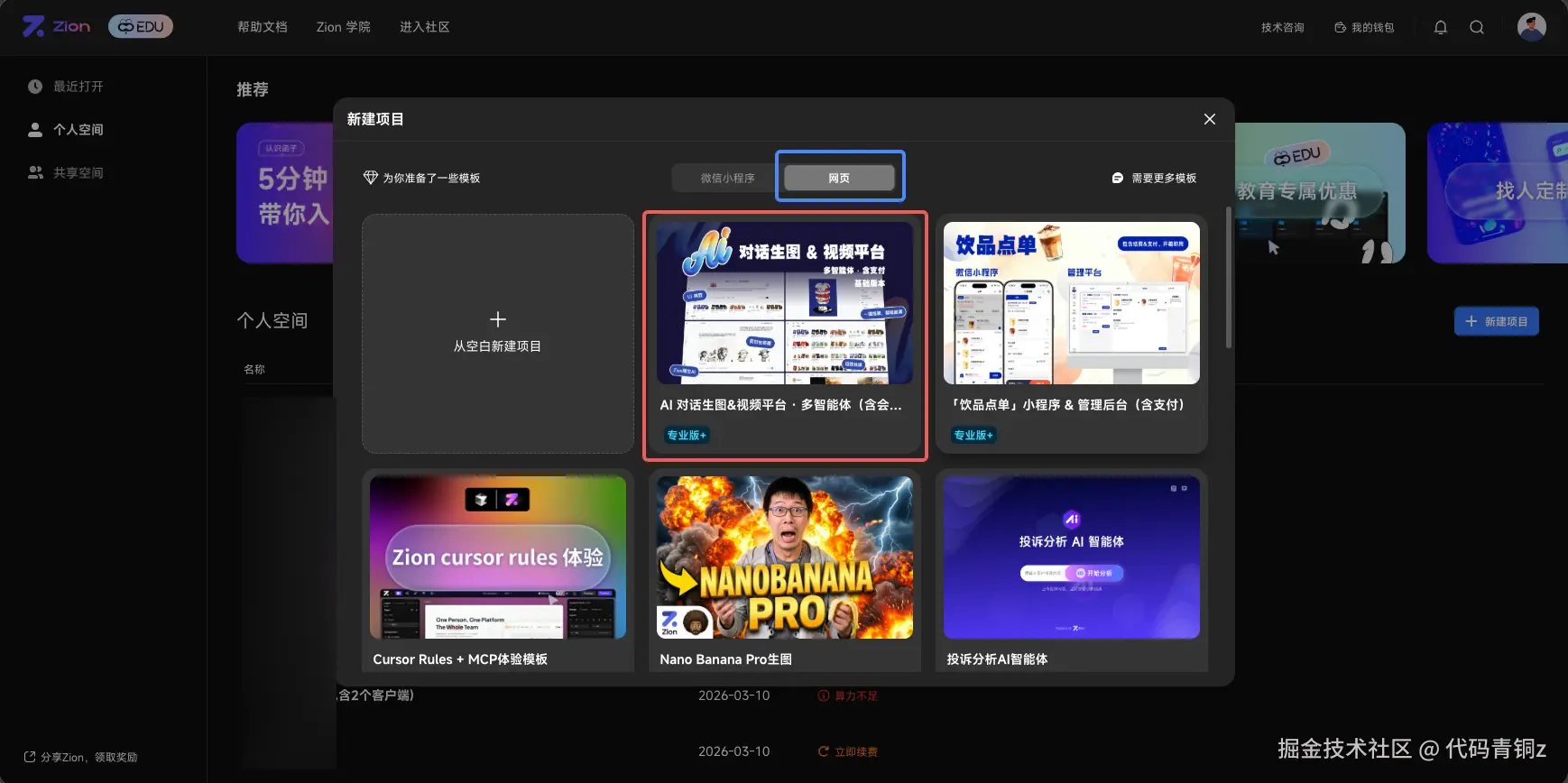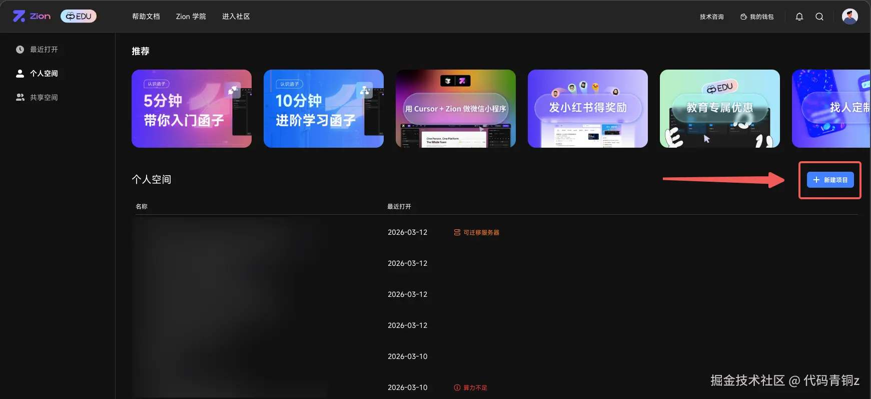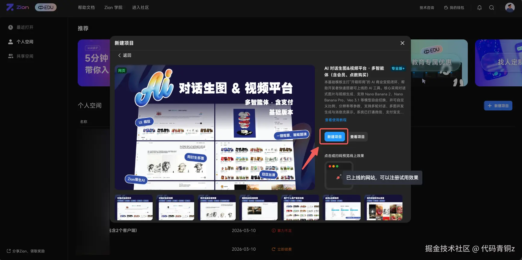 登录 Zion 编辑器,点击“新建项目”。