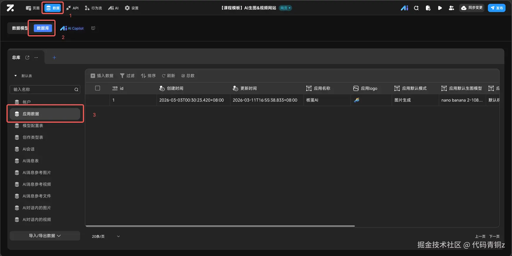 在“数据页面 - 应用数据表”中,直接修改你的应用名称、Logo、默认模型配置及用户协议。