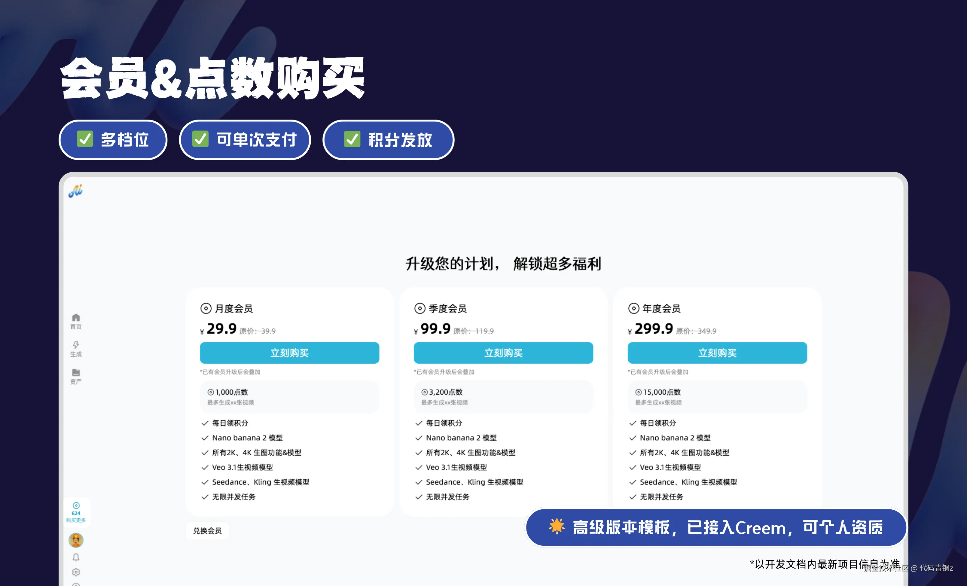 商业闭环: 不仅能看,更能卖。已跑通会员体系与点数消耗逻辑,对接国内主流支付接口。