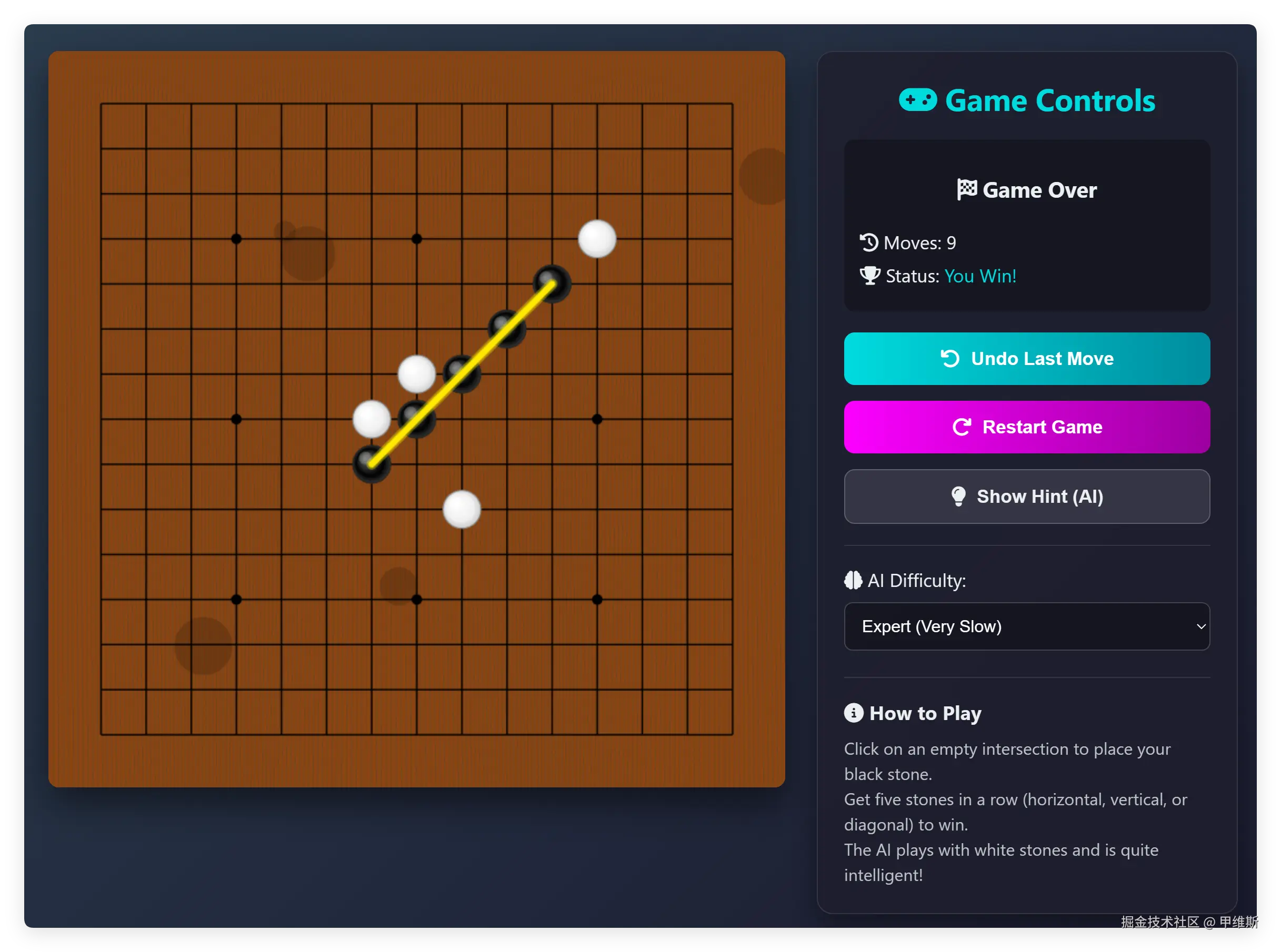 写了个五子棋,布局没啥问题,但是它写的 AI 对手非常弱,最高难度都是傻乎乎的。
