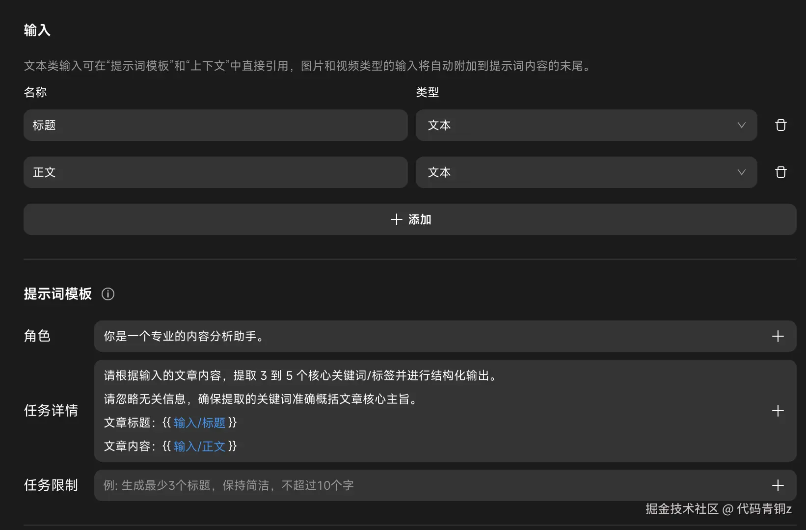 输入变量:添加两个文本类型输入,名称分别为 标题 和 正文。