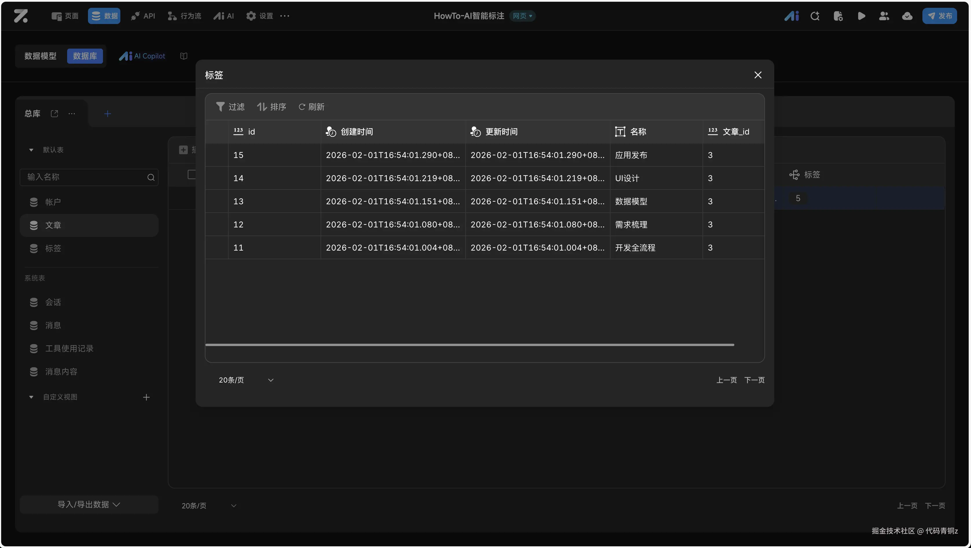 稍等片刻后,进入 数据 -> 数据库 视图,查看 文章 表和 标签 表。