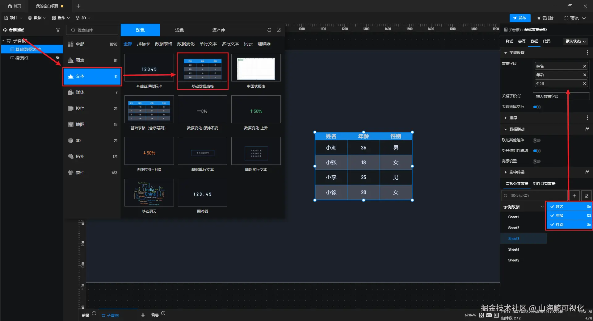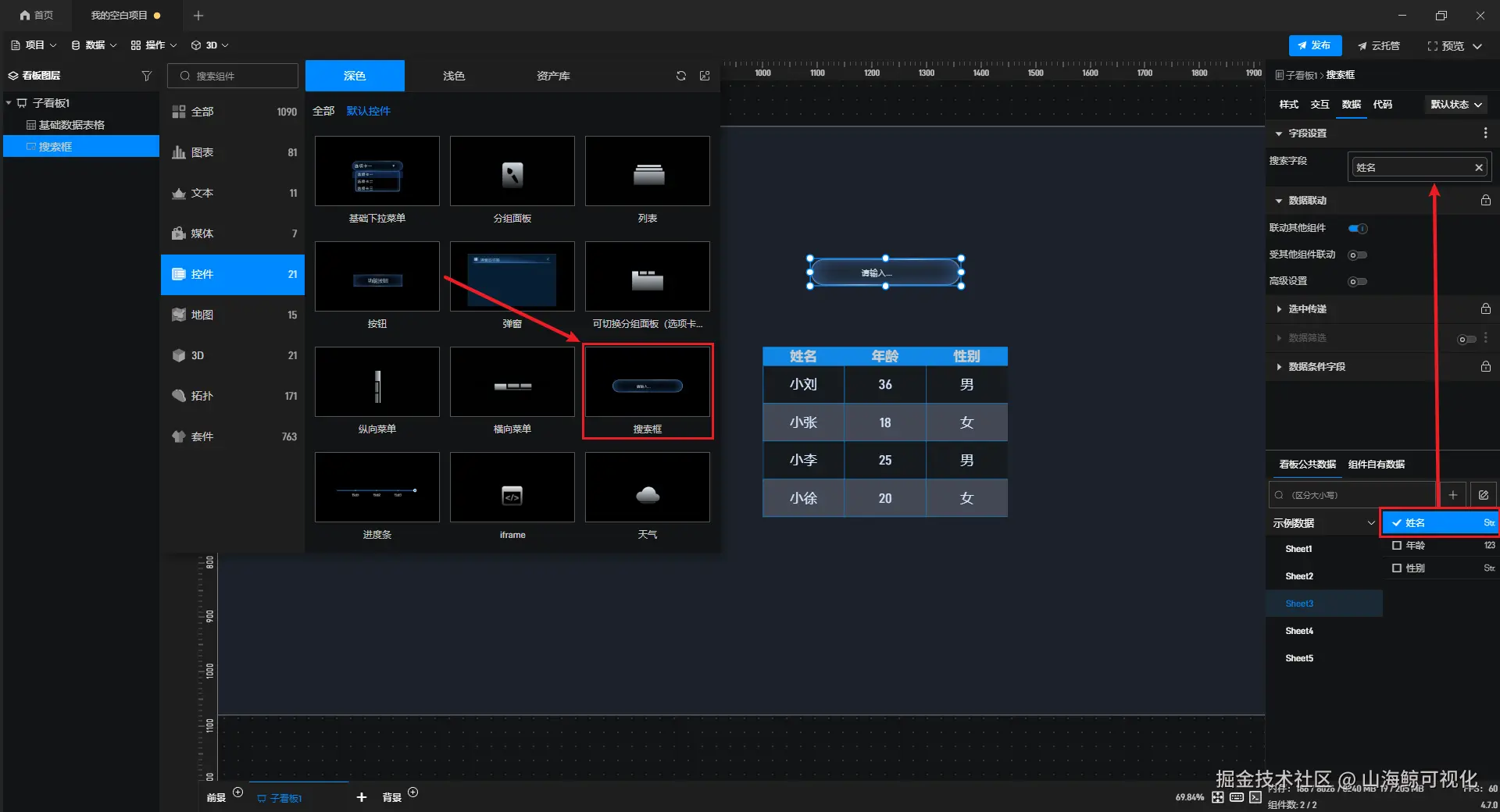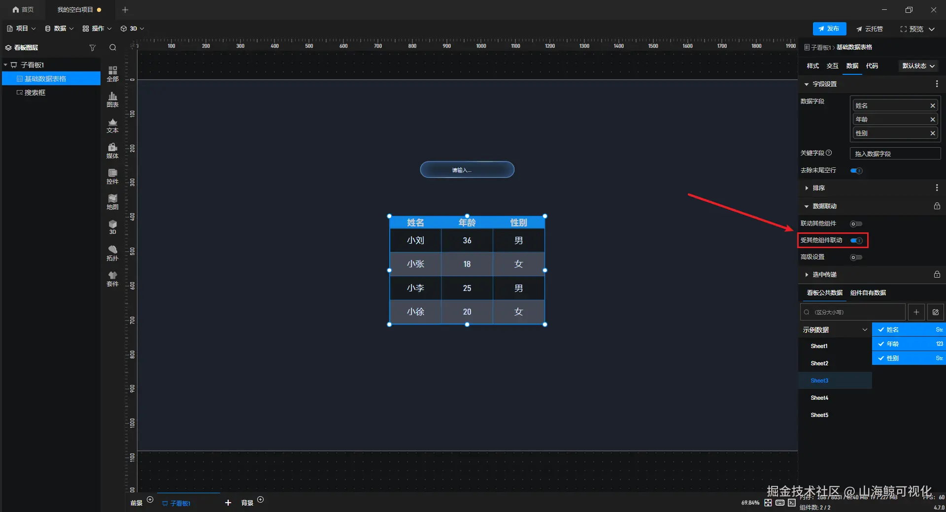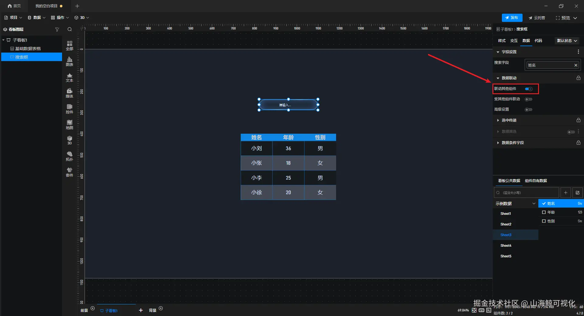 【山海鲸实战案例】如何通过搜索框组件查找数据表格中的数据? 山海鲸可视化 2026-03-30 0 阅读1分钟 在制作可视化项目时,我们有时候需要对数据表格中的数据进行精确搜索,此时我们就可以通过搜索框组件来进行查找。 下面我们就来看一下,该如何通过搜索框组件查找数据表格中的数据。 首先,添加一个 “数据表格” 组件,并为其添加数据字段。 接着添加 “搜索框” 组件,并在 “搜索字段” 中添加需要进行搜索的字段,例如这里添加的是 “姓名” 字段。 然后打开 “联动其他组件” 。 选中 “数据表格” 组件,打开 “受其他组件联动” 。 这样我们就设置完成了,最终效果如下图所示: