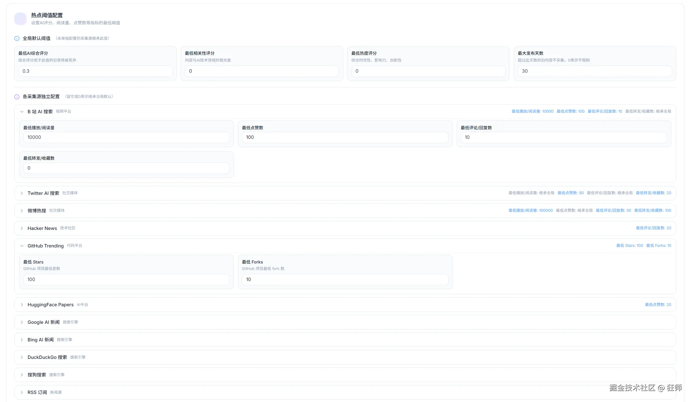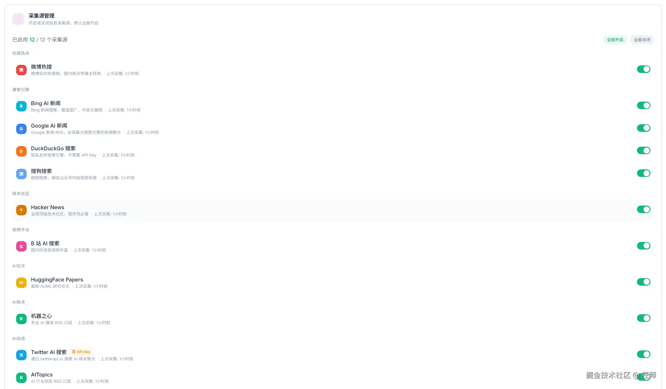 采集源管理(覆盖 Bing、Twitter、Google新闻、DuckDuckGo、HackerNews、搜狗、Bilibili、微博、GitHub Trending、HuggingFace Papers、RSS 订阅等)