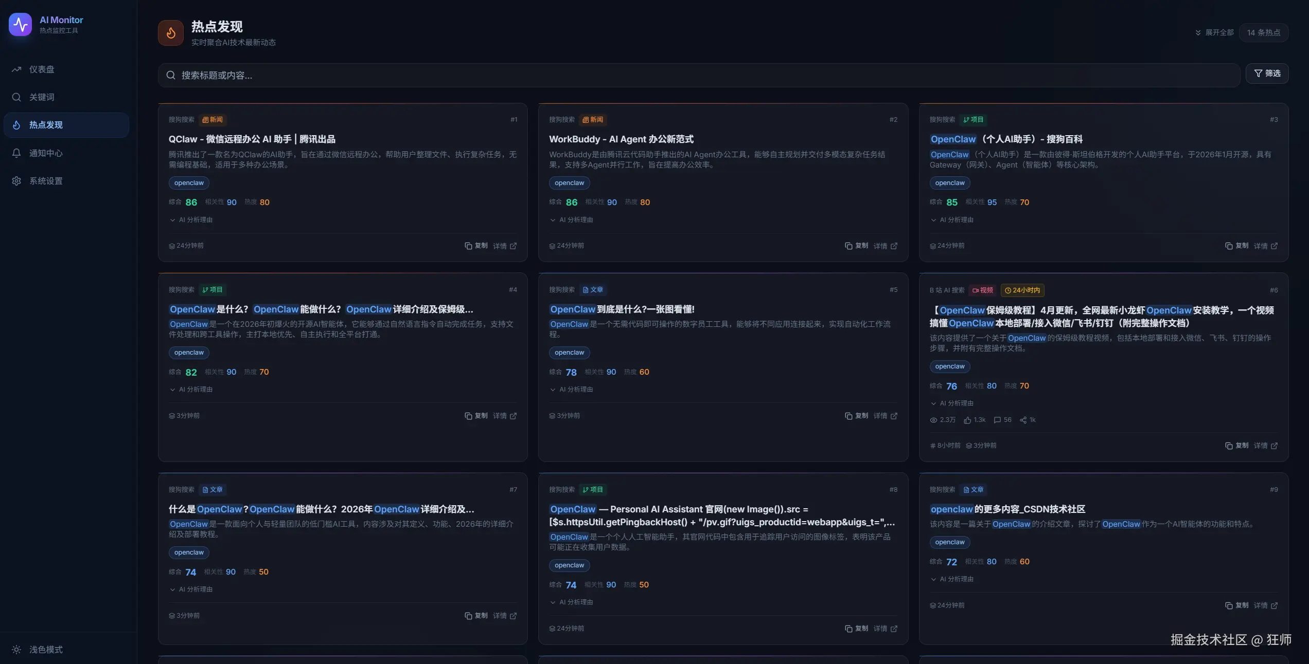热点发现页 (支持搜索、筛选、排序、热点信息卡片上信息丰富,含AI相关性评分 + 热度评分,综合判断内容价值)