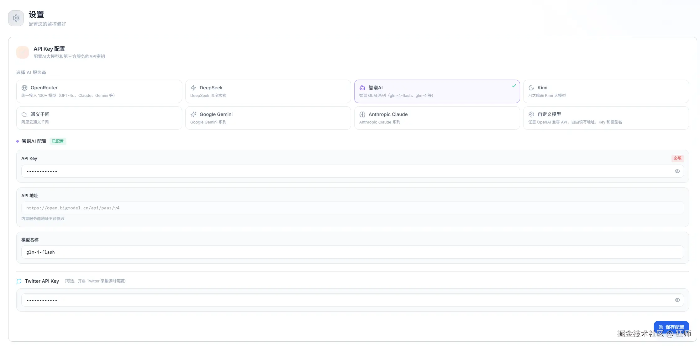 AI 大模型配置(多AI供应商支持,支持 OpenRouter、DeepSeek、智谱GLM、Kimi、通义千问、Gemini、Claude、自定义模型)