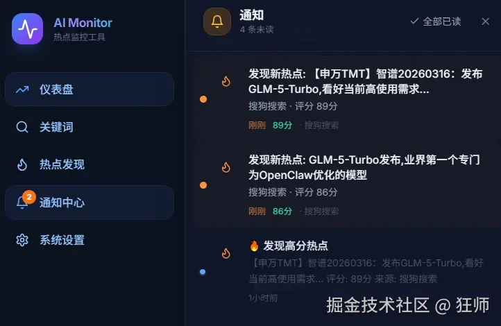 - 应用内通知面板 - AI发现新热点时实时推送到侧边栏通知面板