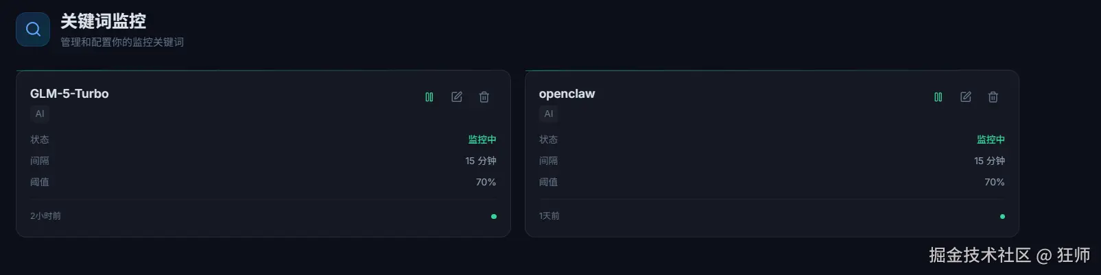关键词监控页面(可自主增删改、开启、暂停关键词)
