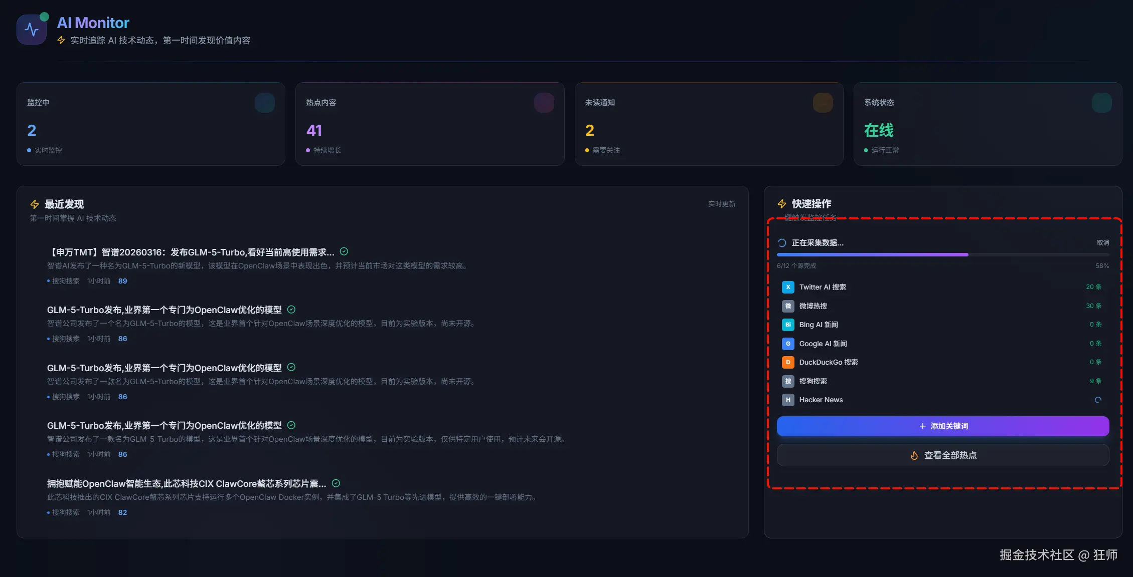 我做「AI 热点监控工具」这个项目,初衷很简单:不教大家做华而不实的 Demo,而是带着大家从真实需求出发,把 AI 当成解决问题的 “超级搭档”,而不是只会写代码的 “工具人”。从需求拆解、技术选型、架构设计,到 AI 集成、部署上线、能力封装,这套完整的工程思维,才是 AI 时代最值钱的本事。