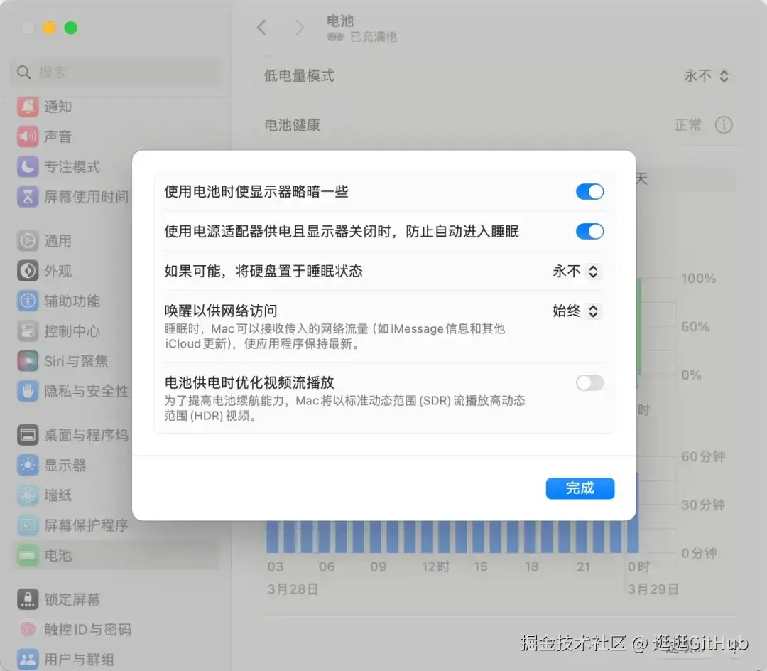 系统设置 → 电池 → 选项 → 打开「防止连接电源适配器时自动进入睡眠」