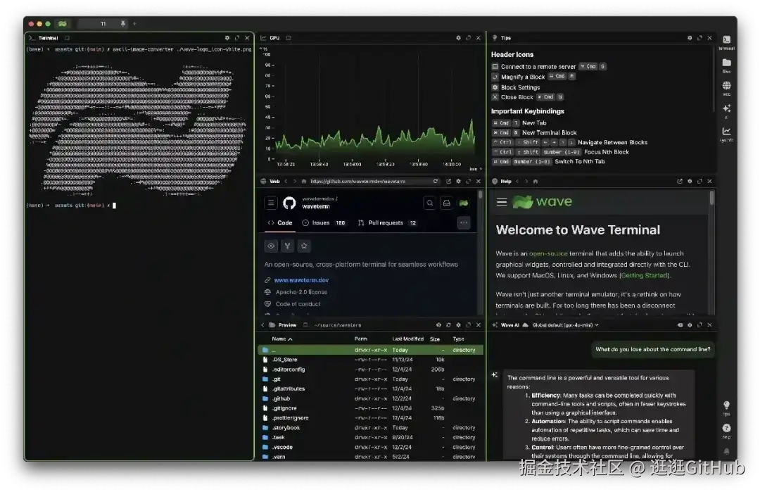 它不是传统终端的换皮,而是在终端里集成了 AI 助手、文件编辑、文件预览、网页浏览,所有东西一个窗口搞定。