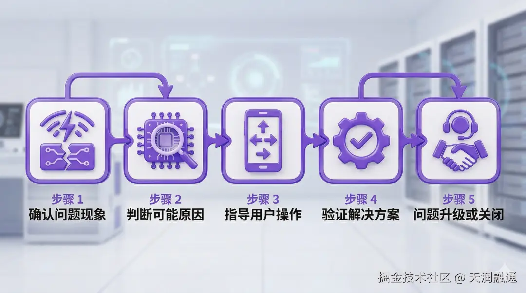 大多数排障,其实都有比较清晰的处理逻辑:先确认问题现象,再判断可能原因,再引导用户操作,最后看问题有没有解决。也就是说,它本质上是一套可以被拆开的判断流程。