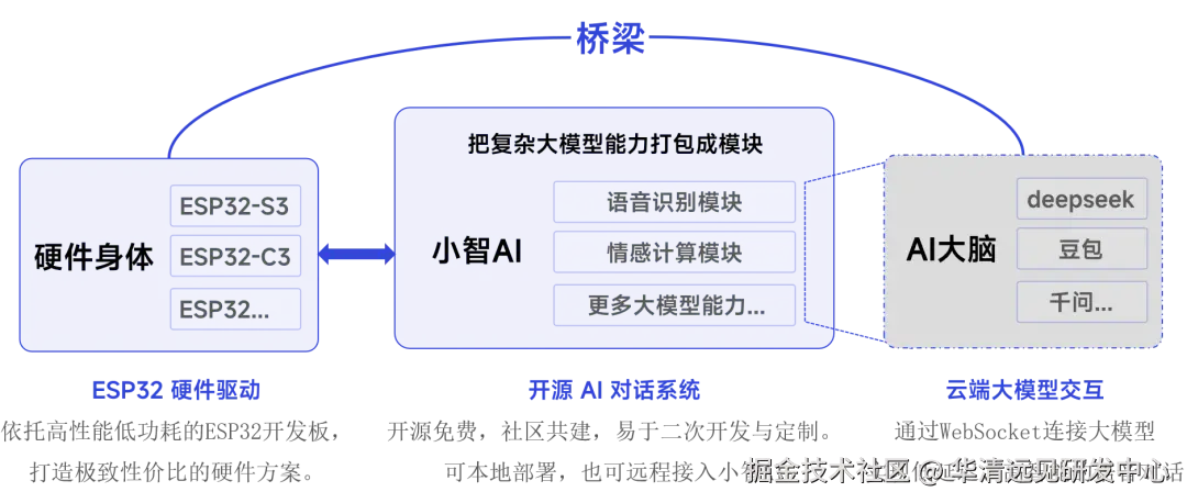 而在开发者看来,它是一套超友好的开源 AI 对话系统,把复杂的大模型能力打包成语音识别、情感计算这些简单模块,用性价比超高的 ESP32 系列开发板做硬件载体,再通过 WebSocket 对接豆包、deepseek 这些云端大模型,就能实现低延迟的智能语音交互。