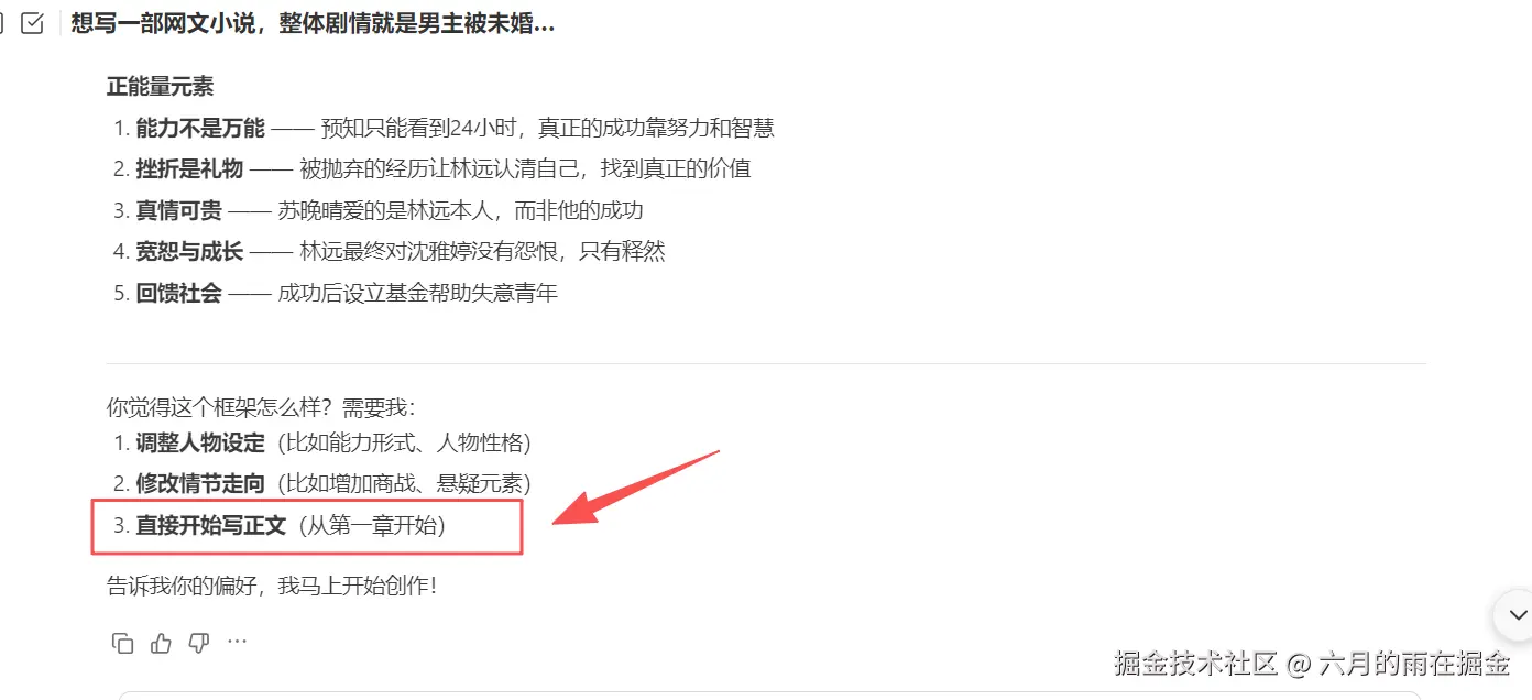 同时生成网文大纲,在结束之后会给出下一步的命令指示,针对上面的大纲内容及简介,我们还需要做什么。这里简单点,我们直接开始写正文