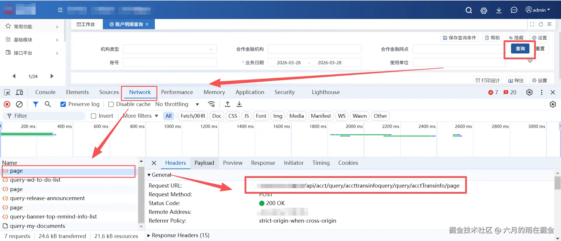 分析日志第一步,我们需要让生产服务器产生我们请求页面的访问日志,那么这时我们就可以在页面进行查询来抓取请求地址,我们可以用谷歌浏览器,用【F12】打开浏览器控制台,选择【Network】这时,我们可以看到页面查询的具体请求地址