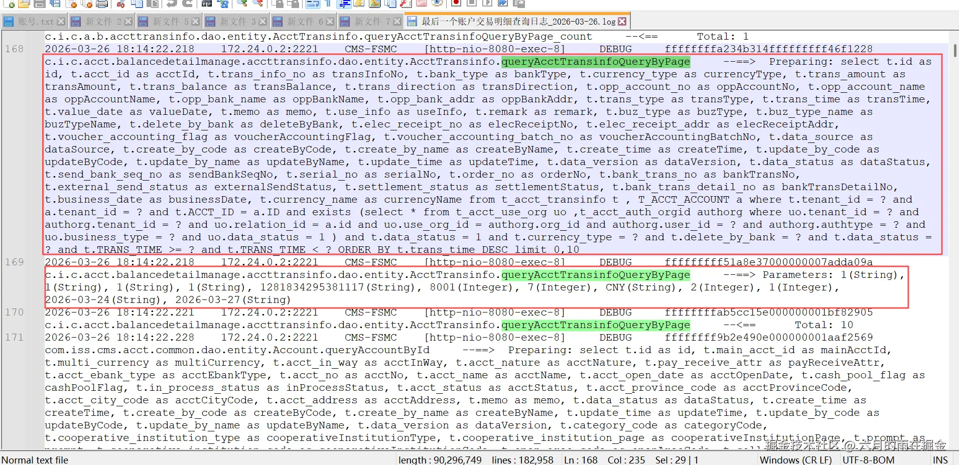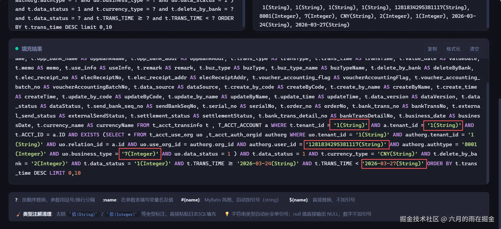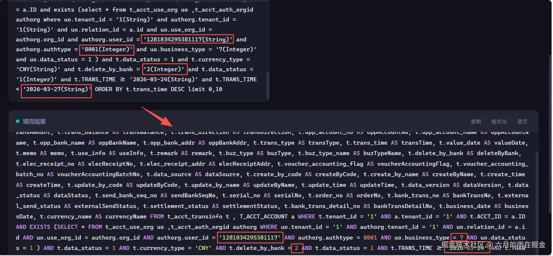 排查过日志文件中sql 查询语句的都知道,sql 查询语句打印的往往是sql 语句和 sql 参数是分开的,就像下面这样。sql 参数少的时候,我们可以手动填充参数,
