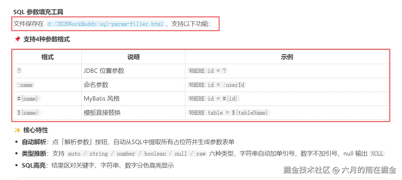 分析完成后,WorkBuddy 会自动丰富我们的 sql 参数填充页面,增加关于参数后面参数类型的替换内容