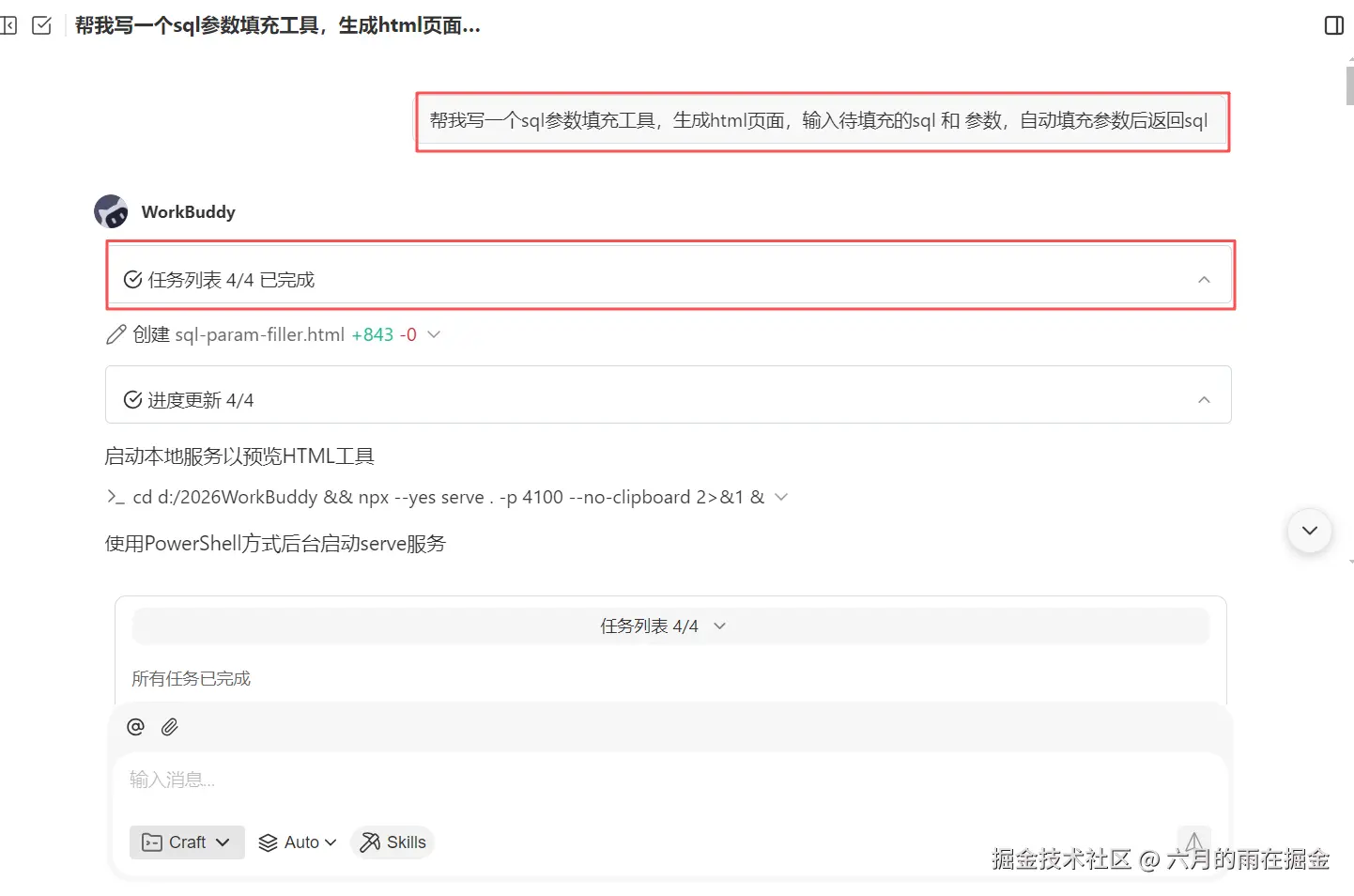 WorkBuddy会自动根据我们的描述开始来创建任务列表,帮助我们生成我们想要的sql 参数填充工具