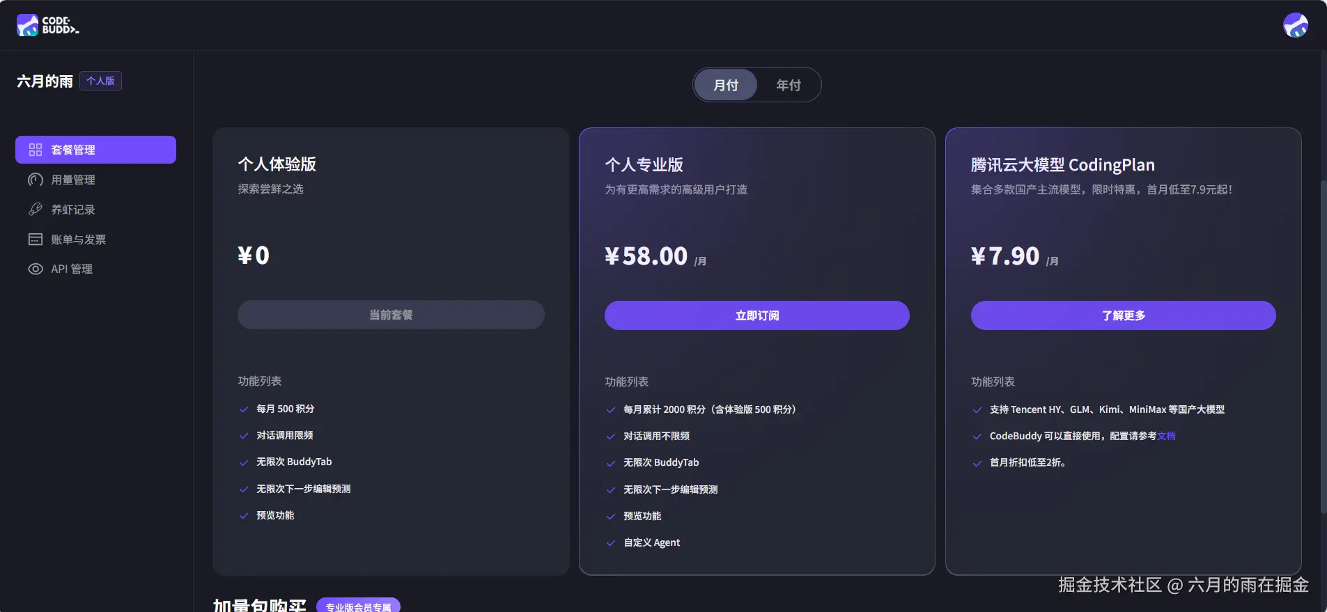 WorkBuddy目前采用的是个人体验版(消耗积分方式)、个人专业版(按月/年计费方式),大家可以不用太担心Token的问题了。
