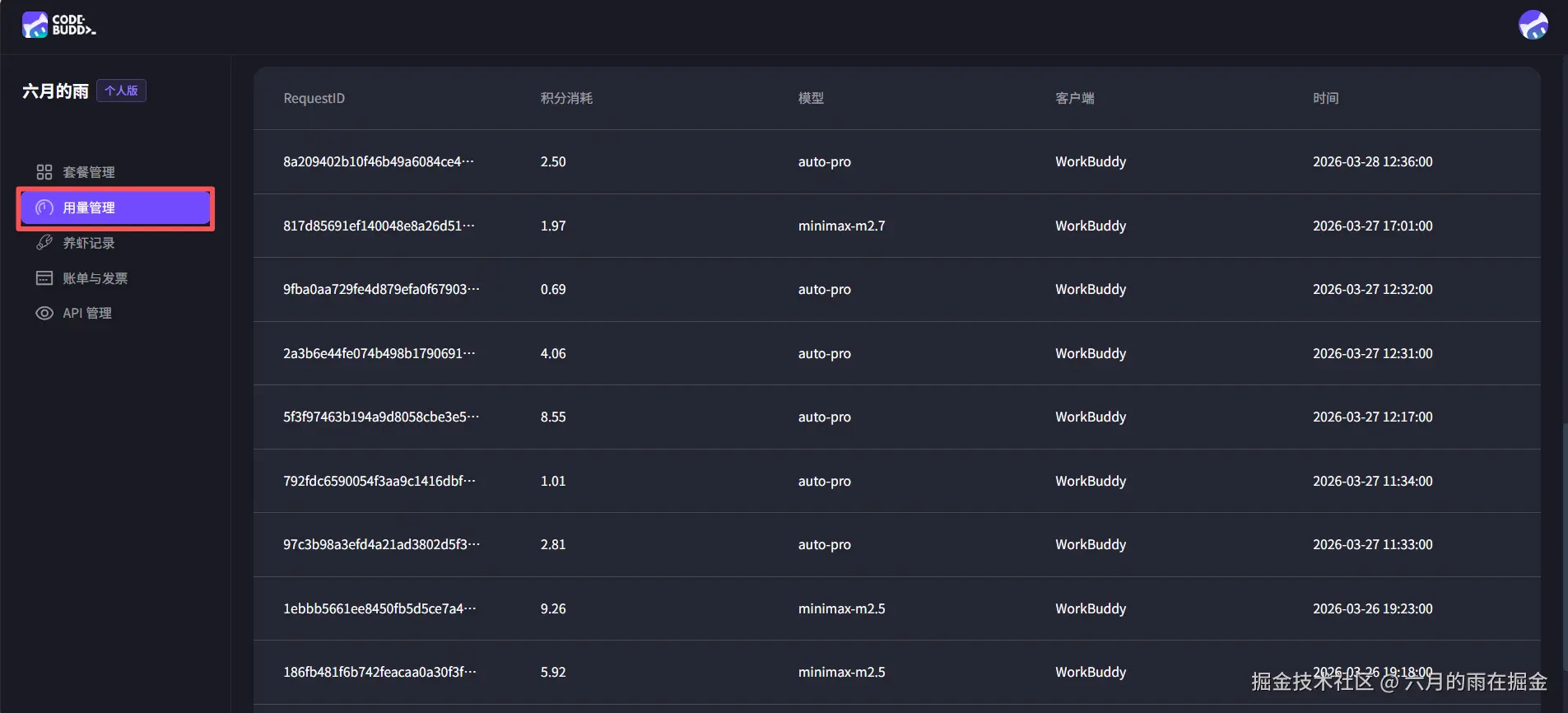 关于积分的消耗,大家也不用担心,很省的,每天敞开了用,大概500积分足够用了,具体的积分消耗也可以通过WorkBuddy 左下角【用户名】-【积分余额】-【用量管理】看到