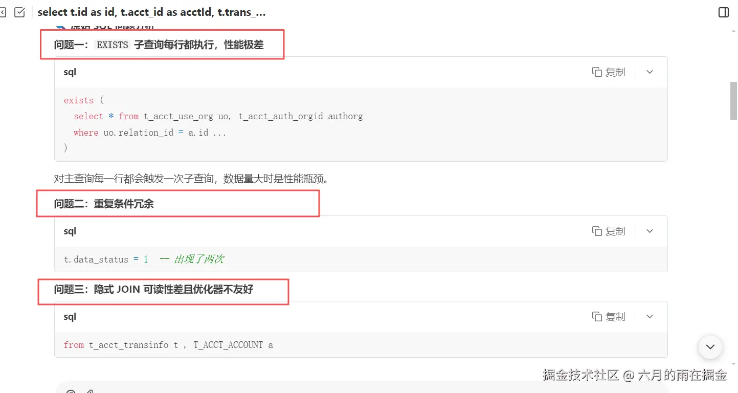 在接收到我们的需求之后,WorkBuddy 会对我们给出的sql语句进行分析并指出现在sql 语句存在的问题