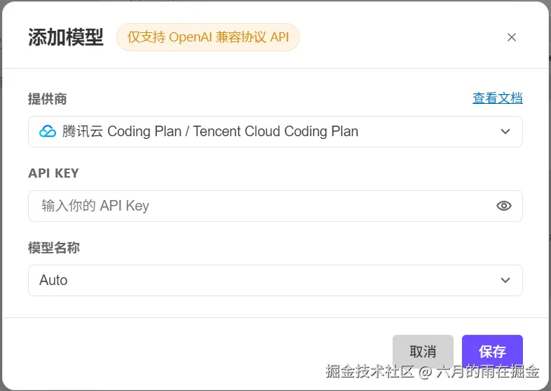 点击这里的【配置自定义模型】在打开的【添加模型】页面选择模型提供商,输入API KEY,选择模型名称后点击【保存】完成添加