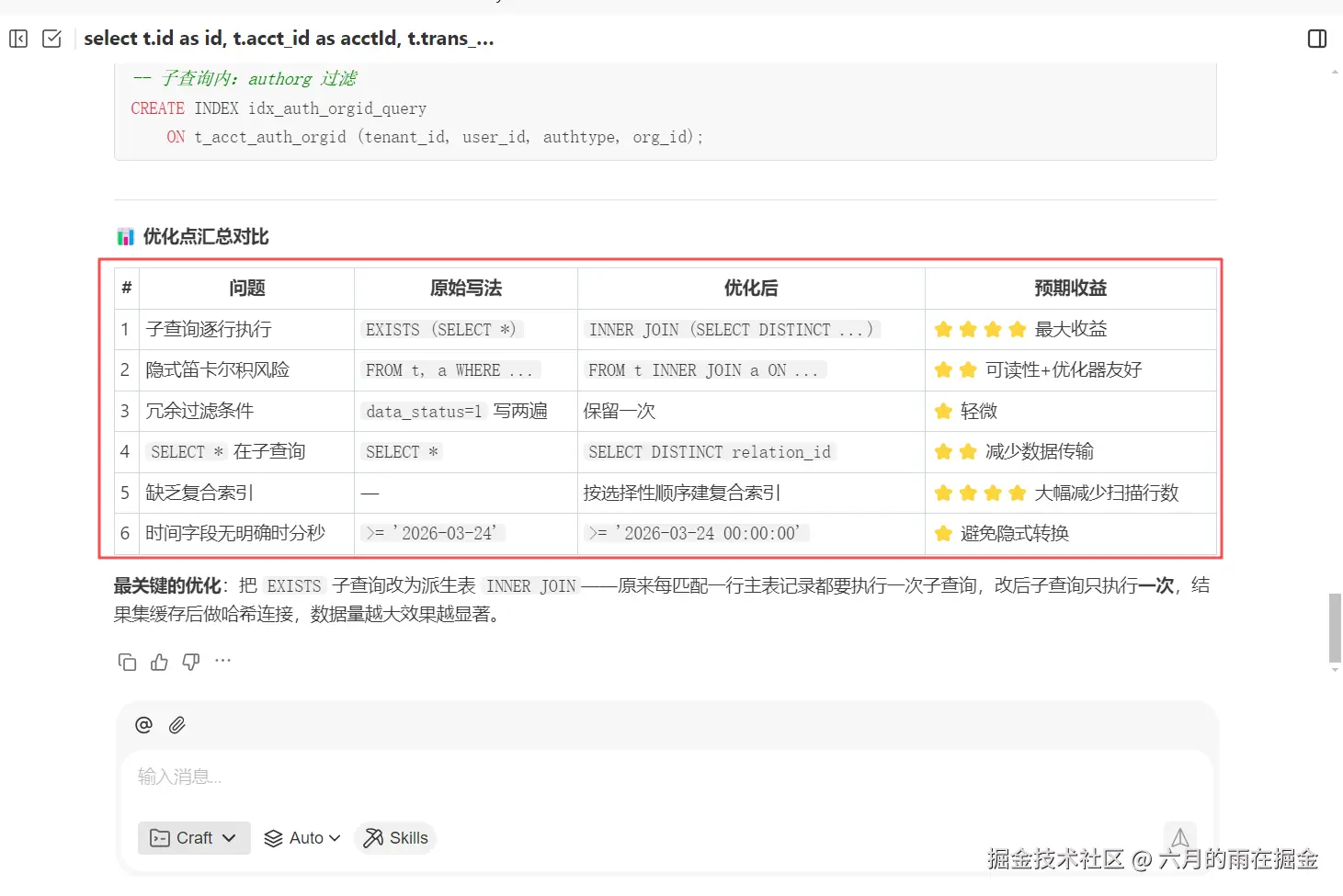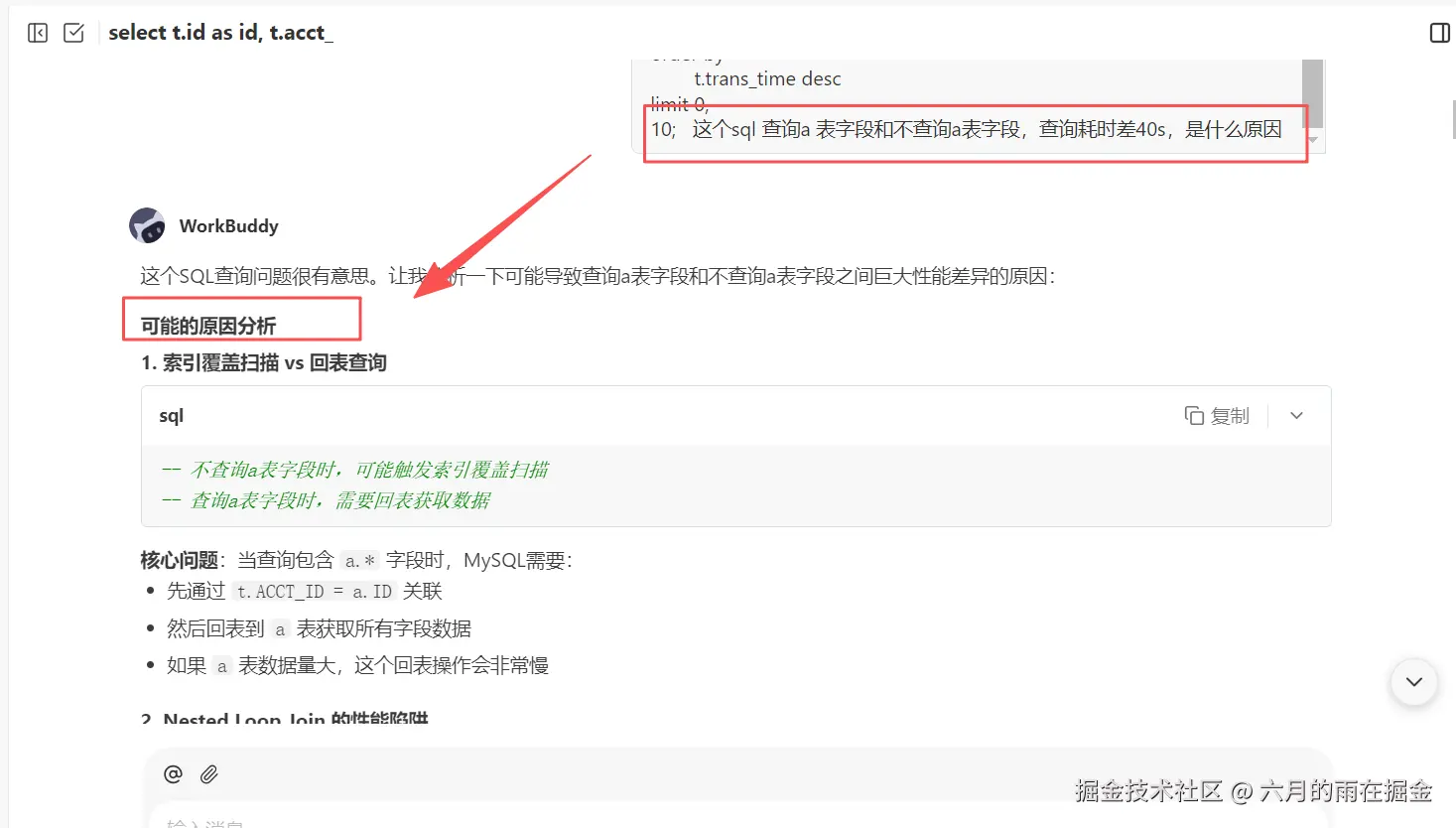 然后我们就可以根据WorkBuddy 给出的原因分析来决定是否在业务上对当前的sql 进行拆分来进一步提升sql 查询效率,比如这里提到 sql 语句中 查询 T_ACCT_ACCOUNT 的字段会触发回表操作,那么我们就可以在此处不查询 T_ACCT_ACCOUNT 表字段,而是拆分后遍历通过 id 查询来补充 T_ACCT_ACCOUNT 表字段,进一步提高查询效率。