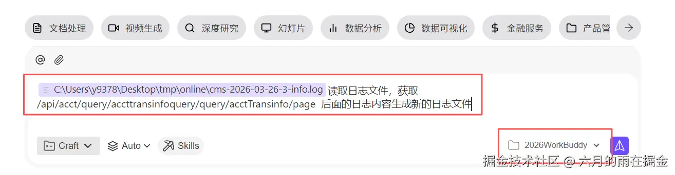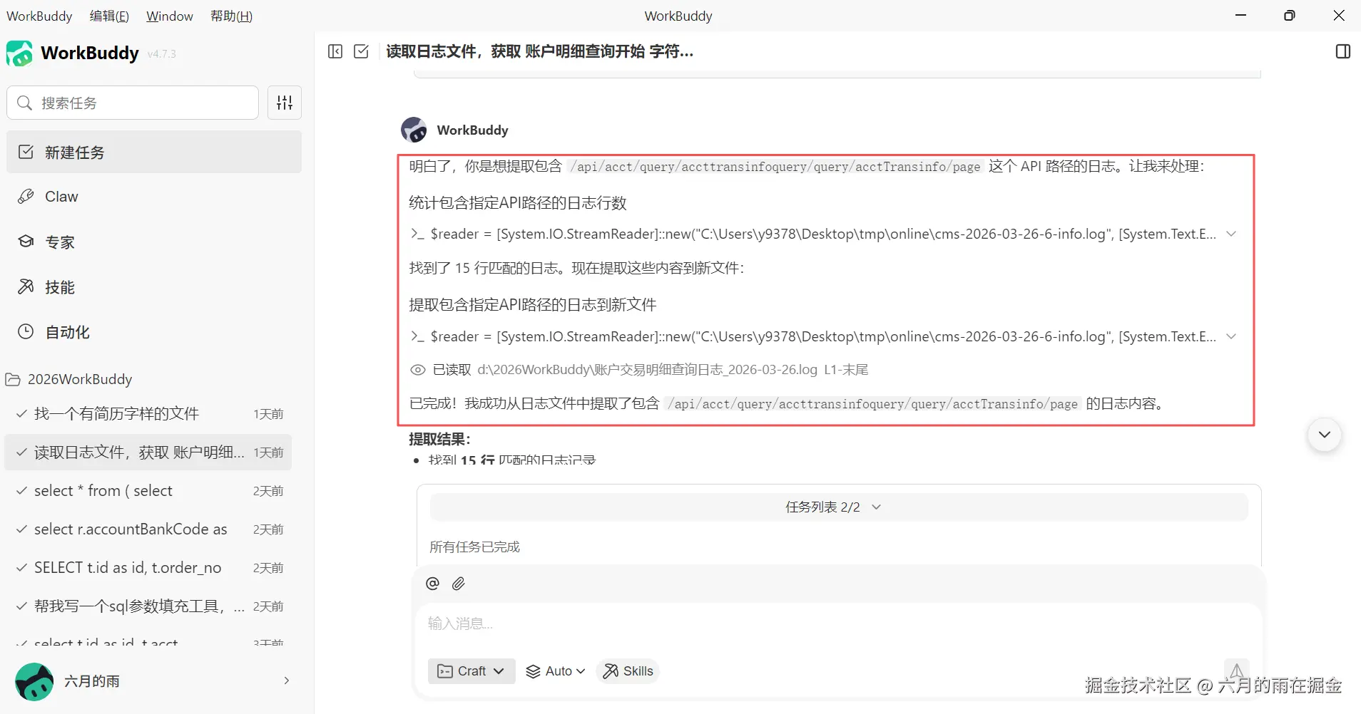 在接收到我们的需求后,WorkBuddy 会自动对日志文件进行解析,读取日志文件内容,并获取我们提供的请求地址相关日志,最终生成新的日志文件
