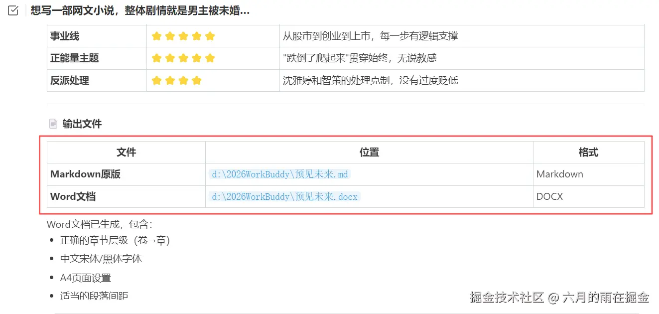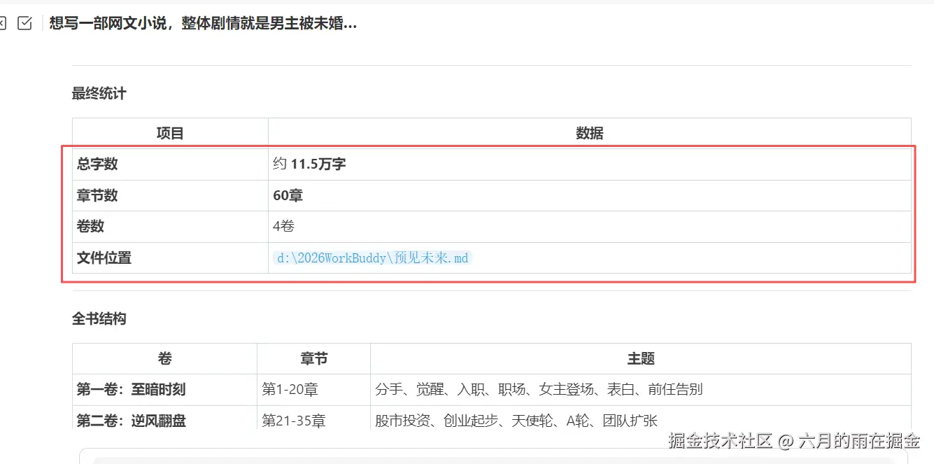 最后你会得到一版新的网文小说原稿,是不是很神奇,只要你大概有一个故事线,那么你就可以让WorkBuddy 帮助你快速写文。虽然故事内容上可能有一些重复或者前后逻辑矛盾的地方,但是你还可以让WorkBuddy 继续帮你修复,最后修复到自己满意的一版。比较好的一点是,WorkBuddy 不是在一版上重复修改,而是每改一版就会生成一个新的文件,保证你想要那一版都有底稿。