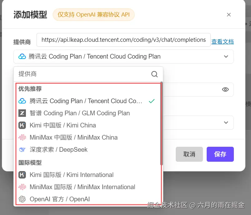 目前支持的自定义模型供应商包括 优先推荐、国际模型、自定义三种方式添加的大模型