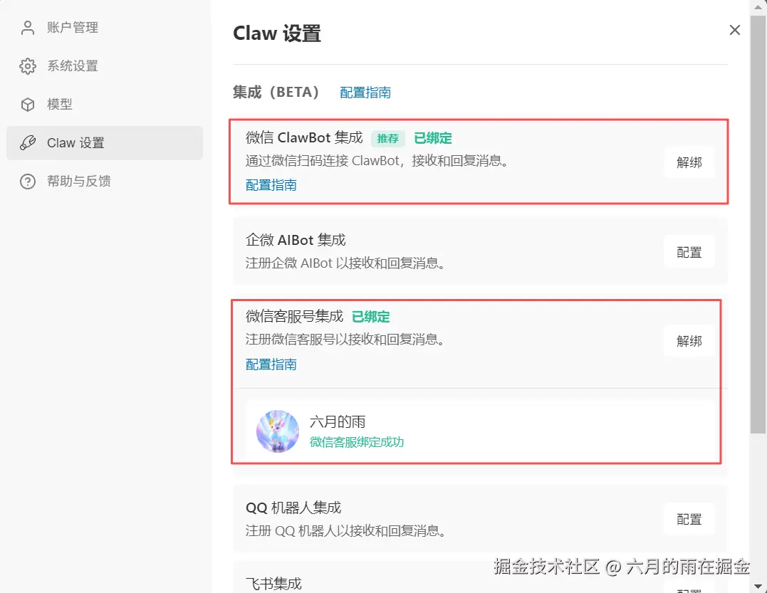 新版的WorkBuddy 目前也支持微信 ClawBot 集成,我们可以像绑定【微信客服号集成】的方式一样直接点击【设置】扫码即可绑定成功。需要注意的是,需要保证我们的手机端微信版本是最新版本,如果不是最新版本的话,扫码会提示你更新,我们就直接更新后安装就可以了,这样可以更方便我们随时随地养虾