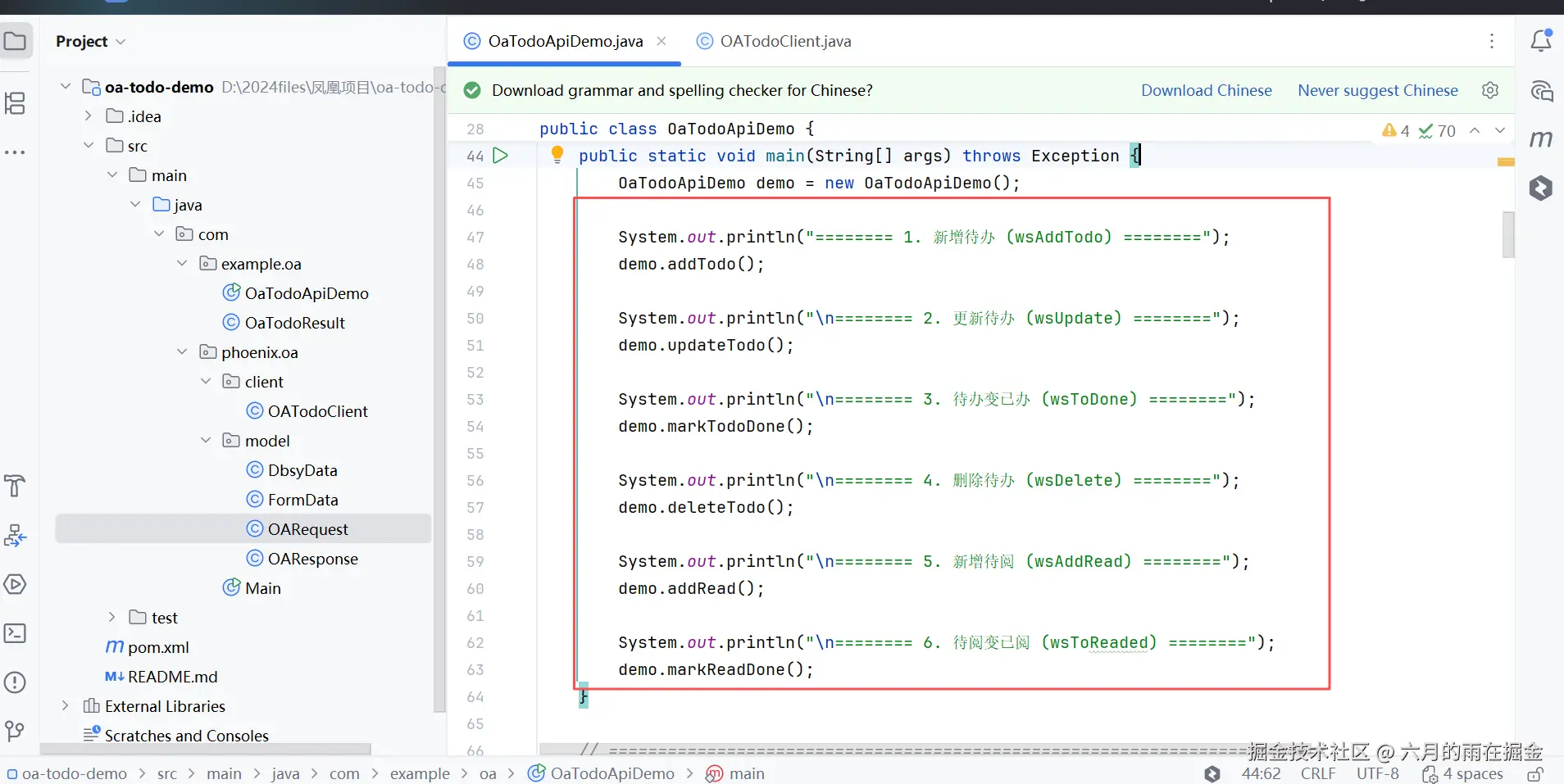 下面我们直接用IDEA 开发工具打开WorkBuddy 帮助我们生成的接口调用demo 可以看到完全符合IDEA 的目录格式,打开就可以直接使用测试