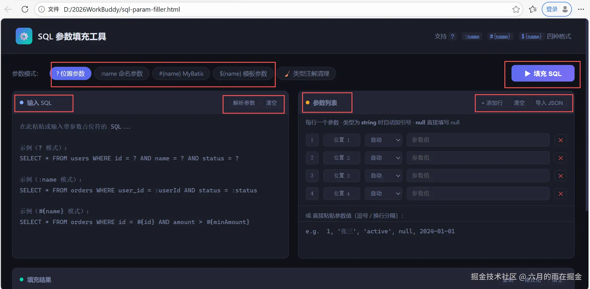 帮我写一个sql参数填充工具,生成html页面,输入待填充的sql 和 参数,自动填充参数后返回sql