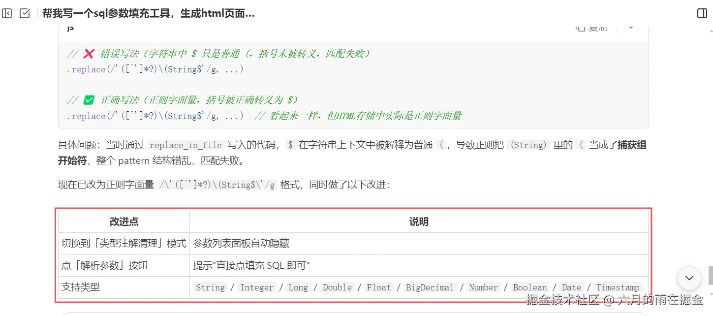 这里我们可以看到参数填充的似乎有点问题,默认把参数类型也给填充进去参数了,这样的sql 肯定是不对的。这个时候我们就可以继续回到我们的WorkBuddy 来优化我们这个sql 参数填充工具,直接将我们填充参数后的 sql 给WorkBuddy 让他分析
