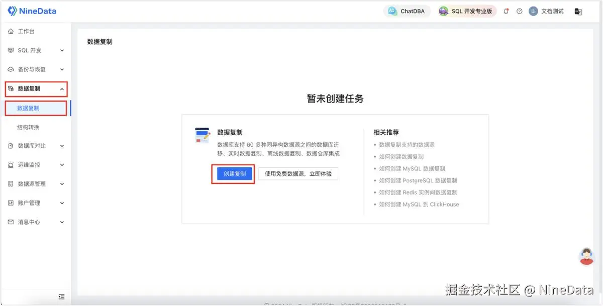 - 登录 NineData 控制台,单击数据复制>数据复制,然后单击创建复制。