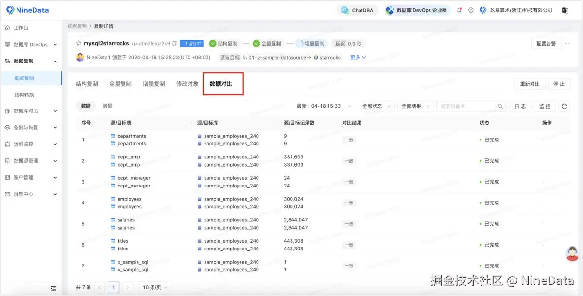 如果从这个角度看,NineData 的价值不只是把 MySQL 数据写进 StarRocks,而是把结构复制、全量初始化、增量同步、DDL 跟随、数据对比和运行治理放进了一条全流程链路里。