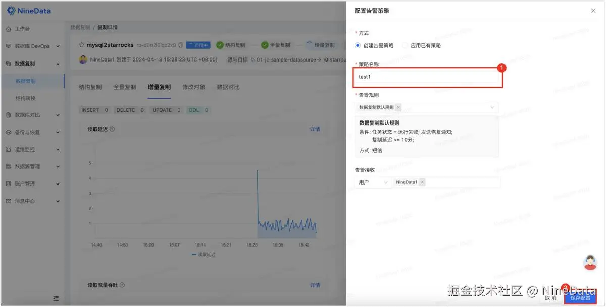 - 输入策略名称,单击保存配置即可。您可以使用内置的默认规则,在任务运行失败,或复制延迟大于等于 10 分钟的时候,发送短信提醒。您也可以自定义创建规则,根据需求进行通知。