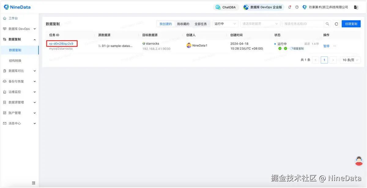 - 登录 NineData 控制台,单击数据复制>数据复制,然后单击步骤二中创建的复制任务 ID。