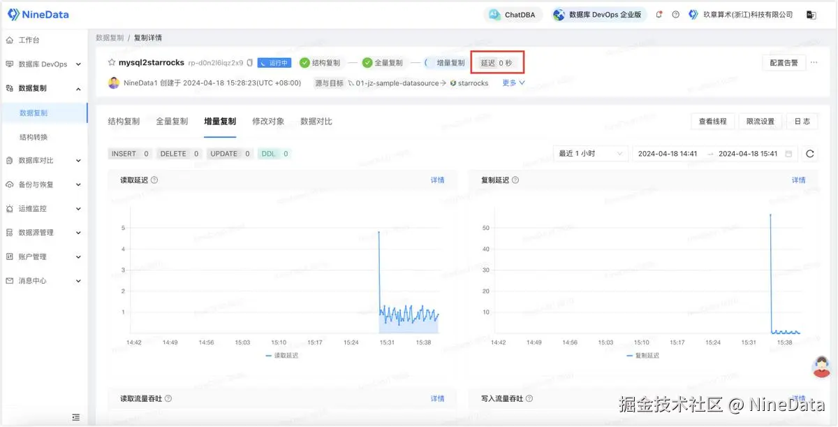 - 配置完成后启动任务,针对您配置的同步对象,NineData 会先对相关存量数据进行全量迁移,接下来实时同步 MySQL 中新增的增量数据。每当目标端的增量数据基本追平源端时,任务面板中会显示延迟 0 秒,表示当前 StarRocks 中的数据已基本追平源端。