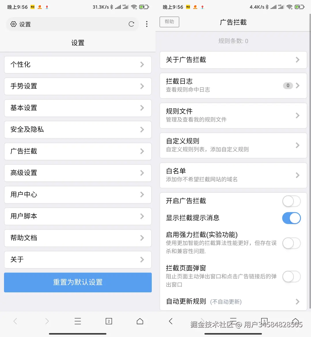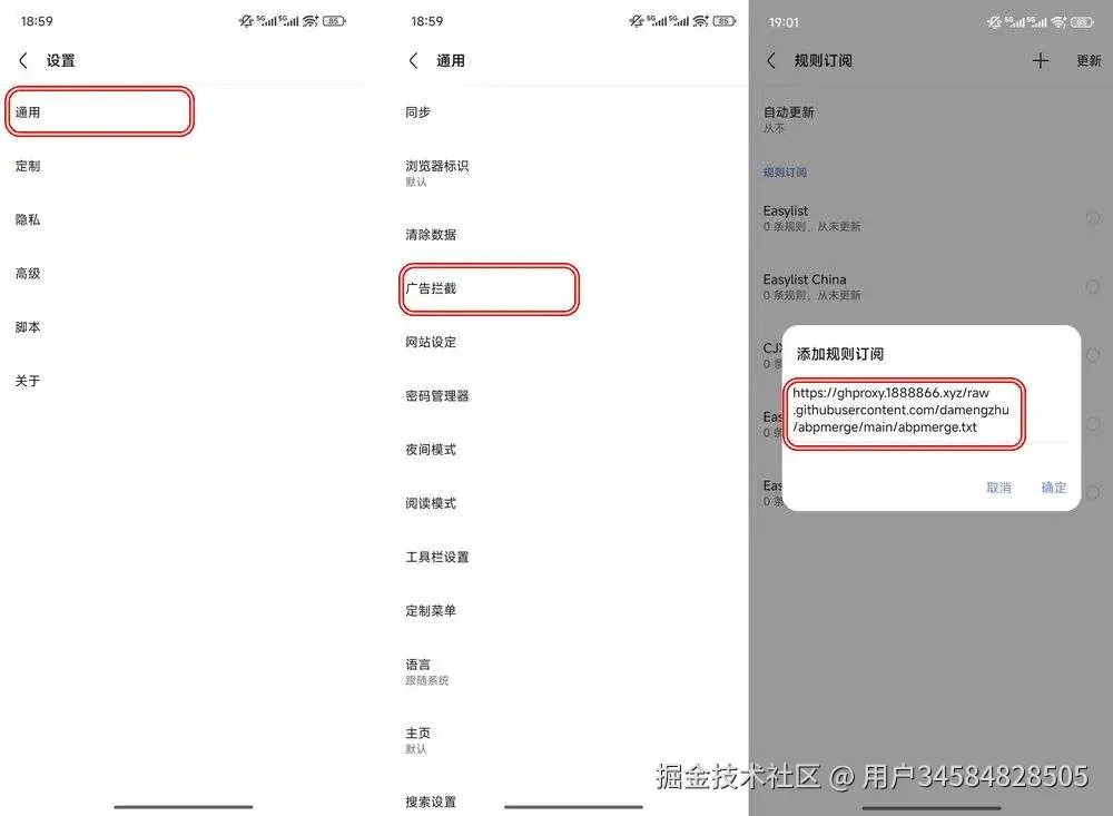 - 打开修改版 Via 浏览器,进入 设置 -> 通用 -> 广告拦截 -> 规则订阅。