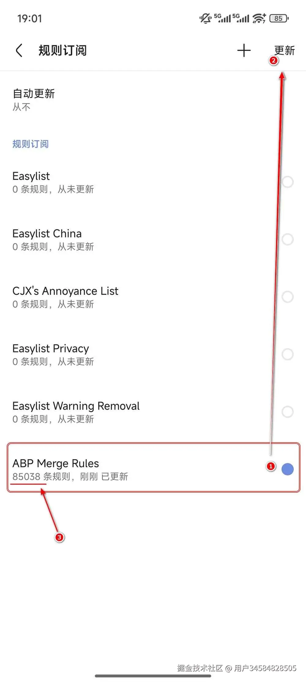 接下来一步非常重要:选择刚才导入的规则,然后点击右上角的更新,只有完成这一步,规则才会真正下载生效。