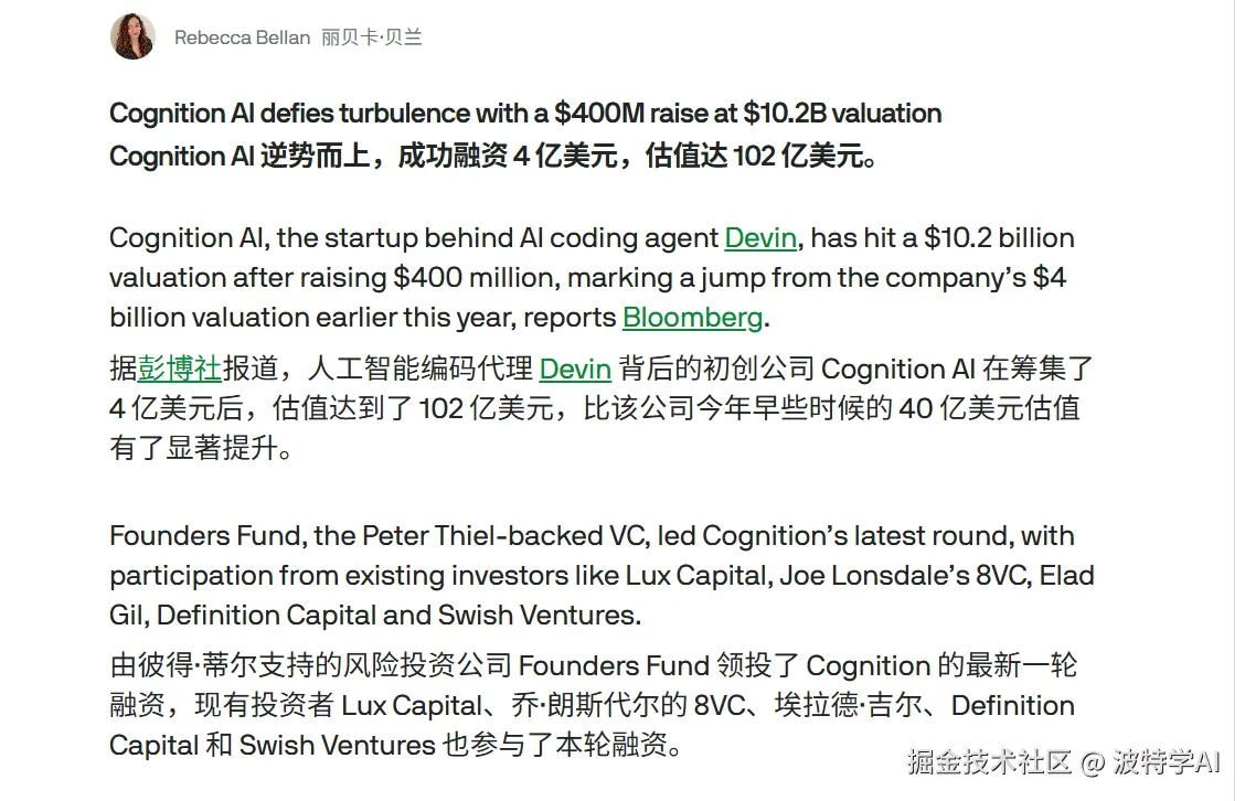 The Information 统计过,过去一个多月,类似的研究型 AI 初创公司拿到的融资讨论总额超过 25 亿美元,整个"neolab"方向累计超过 100 亿美元。Cognition 做的 AI 程序员 Devin,去年 9 月估值 102 亿美元,年收入 7300 万。投资人的逻辑很明确:谁先解决 Agent 之间的协调问题,谁就拿下下一代 AI 的核心能力。