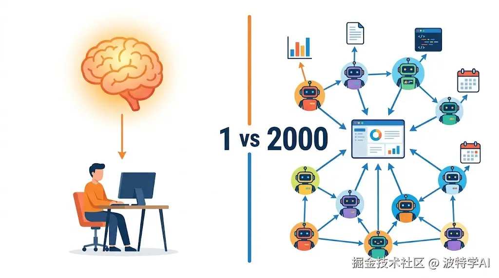 你别想成一个超强 AI 替你包办。2000 个各有专长的 AI,分头干、互相对齐、最后汇总一个结果。