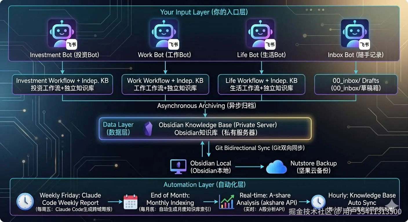 - 自动化层:每周五自动生成跨域周报,每月底生成索引。A股实时行情+最新季报,投资Bot直接调用分析。