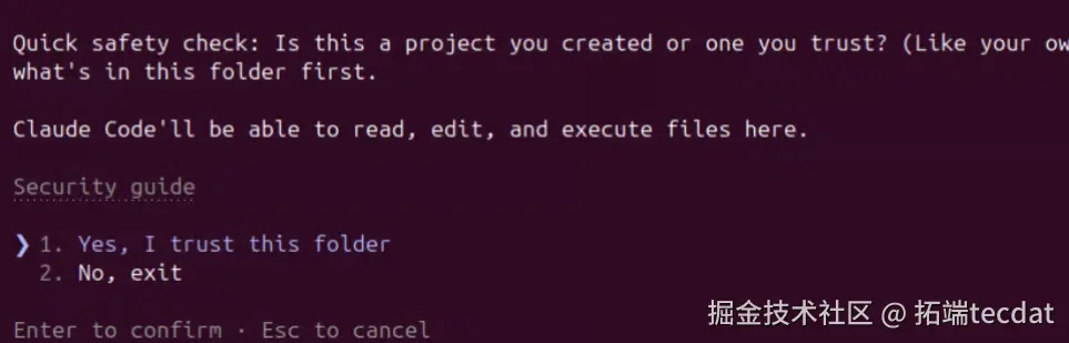 首次在新目录运行 Claude Code 时,需确认信任工作区: