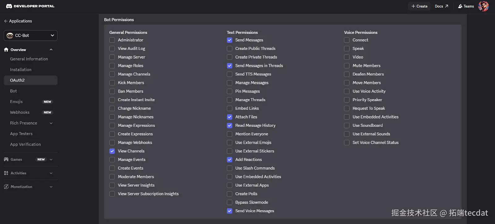 bot作用域,并选择以下权限: -