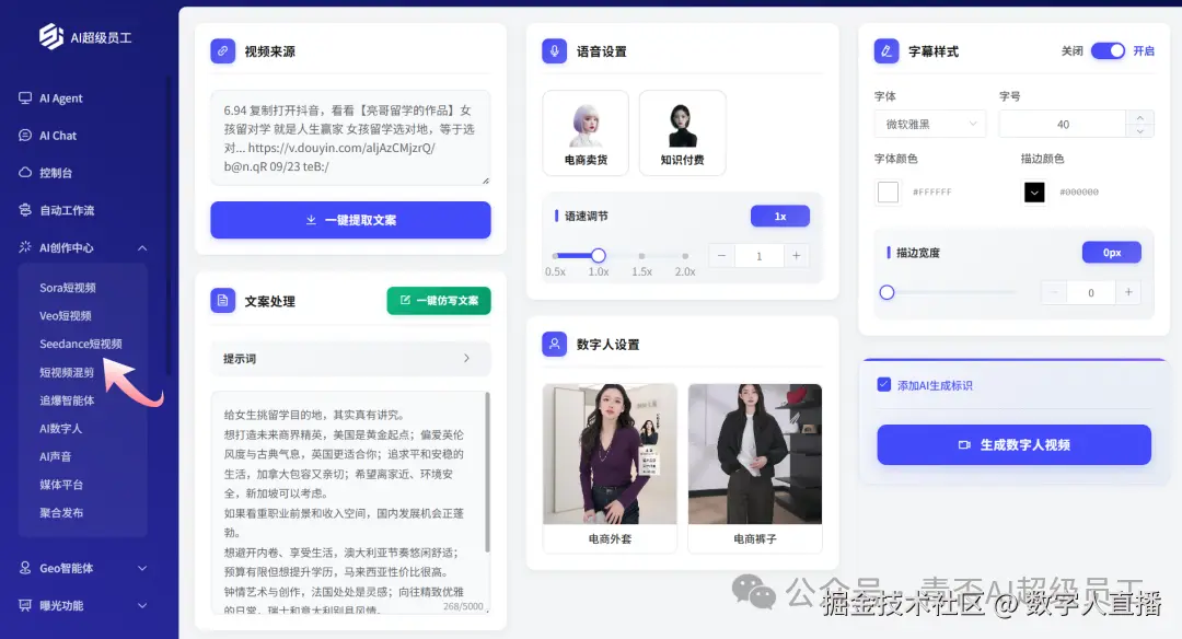 热点的核心是流量密码的复刻,青否追爆智能体让企业轻松拿捏热点精髓:只需输入抖音 / 快手的热点爆款视频链接,AI 会自动提取文案、分析爆款逻辑,同时仿写原创内容,搭配AI 数字人 + 声音克隆功能,1:1 还原热点质感的同时保证原创属性。