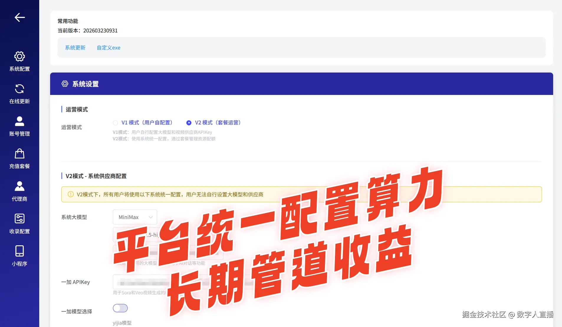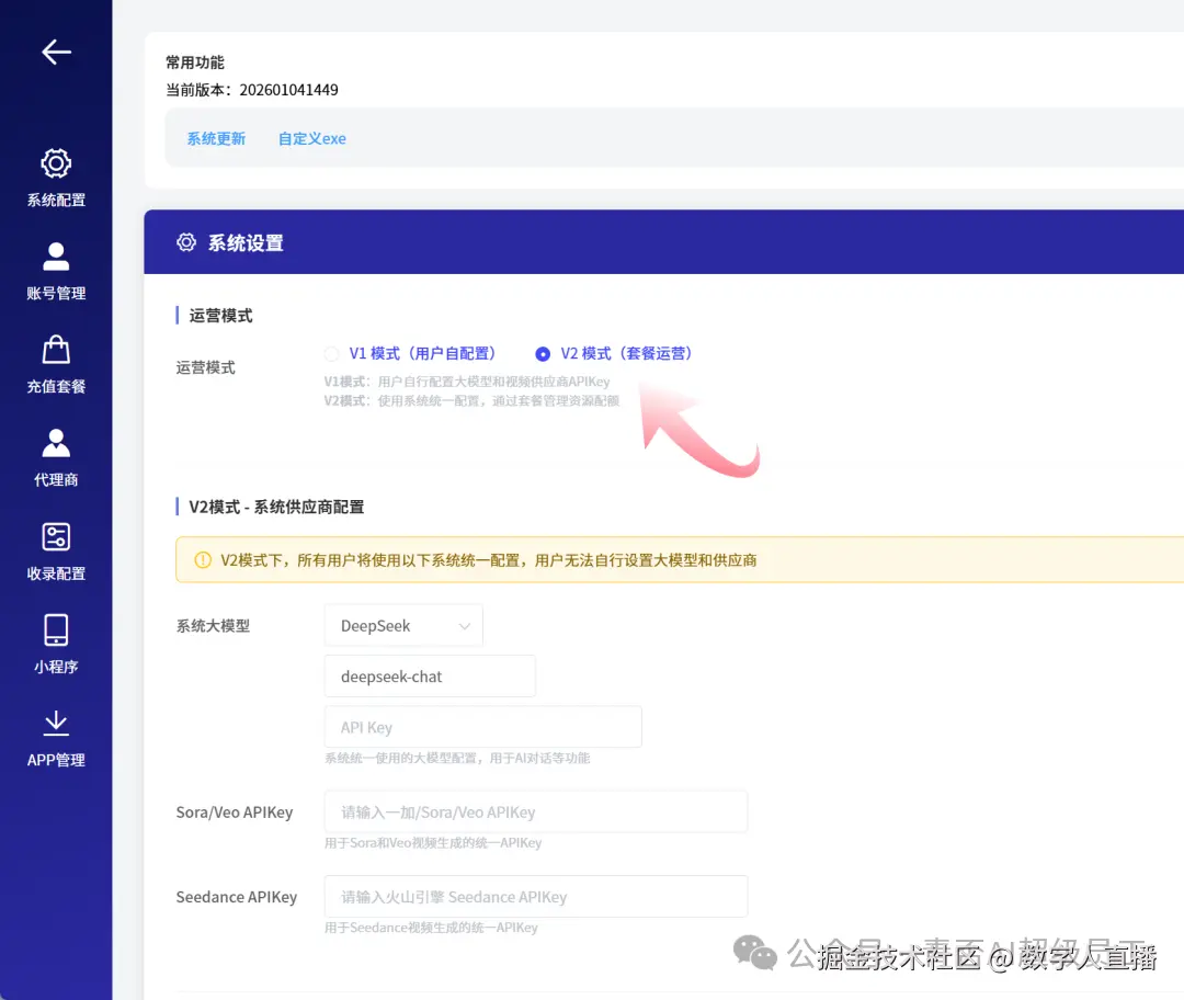 原有的V1运营模式中,每个商家需要自行配置大模型和AI视频供应商的APIKey,操作繁琐,且难以统一管理。