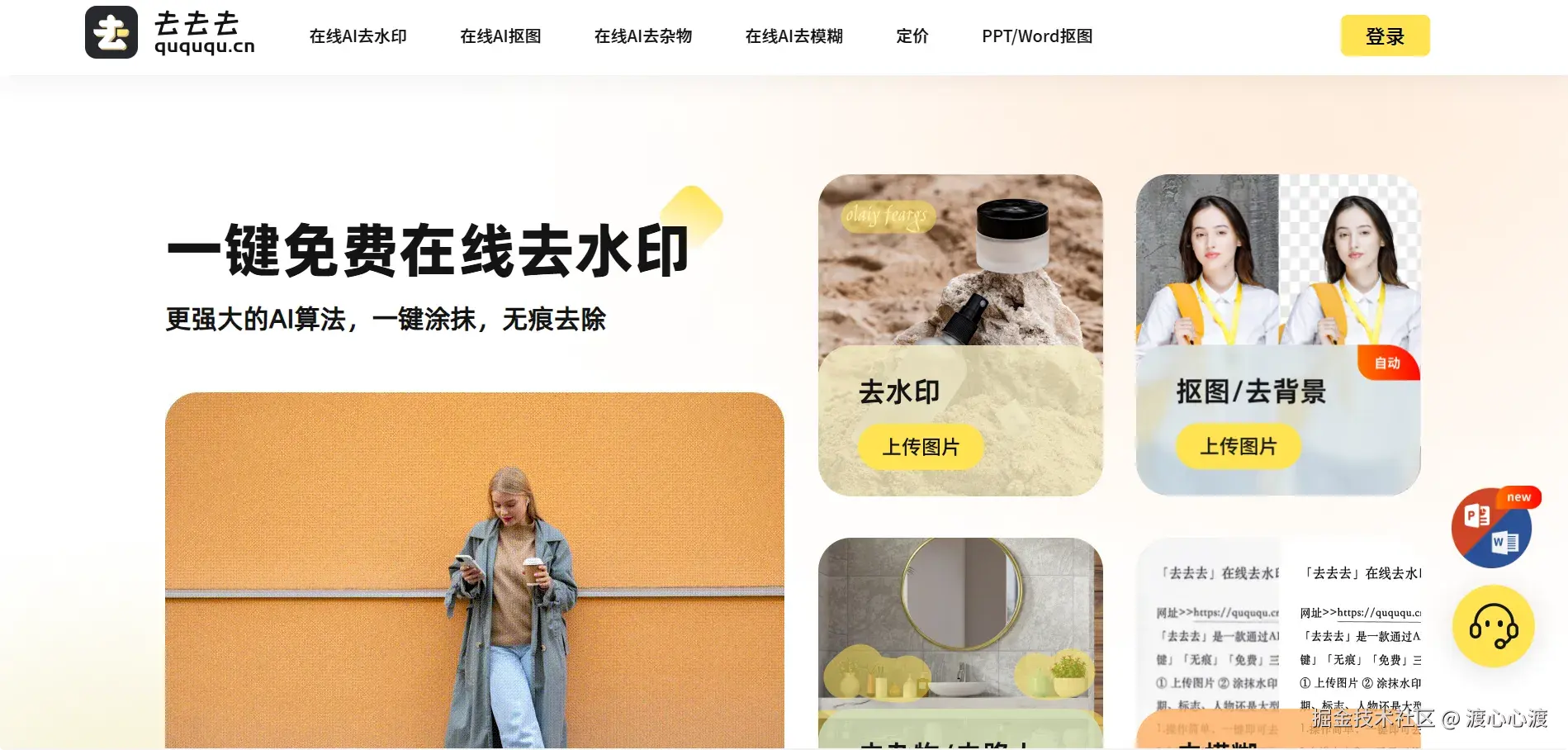“去去去”是一个提供一站式AI图片处理的在线工具平台,主打一键免费在线去水印、抠图、去杂物、去模糊等功能,利用强大算法让用户无需专业技能即可快速、无痕地优化图像,适用于日常修图、素材创作与办公场景。